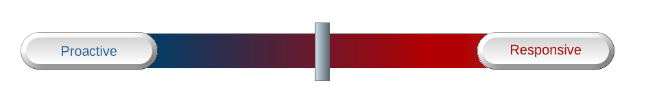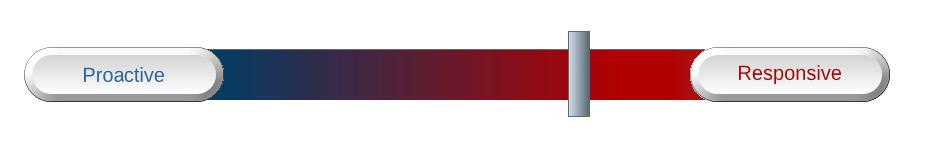 The outcome of this service model overhaul laid down the framework for what we call our Tripod Model of IT support services.  This model balances the proactive aspects of IT (correcting systemic problems, upgrading equipment in a timely manner, etc.) with responsive support to IT incidents that impact your day-to-day operations.  As you’ll see in the diagrams below, the balance between these two aspects of a healthy IT Support program can be visualized as a color spectrum.  A typical blend for each of our three Tripod services is shown here.  Your mileage may vary, of course, but this is a representative idea: